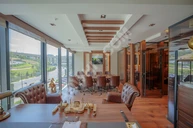الكراسي: 8 كراسي عمل فاخرة من الجلد البني، مع أرجل كروم وعجلات.