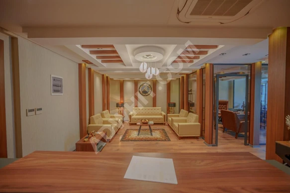 مكتب المدير التنفيذي: مساحة عمل واسعة، مع ملحق جانبي على شكل حرف L وطاولة قهوة أمامية.
