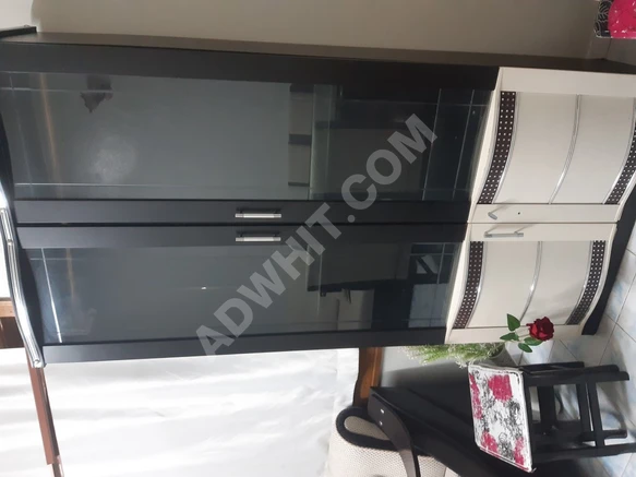 غرفة جلوس بحالة جيده ثلاثيه و ثنائيه و قلاطق عدد ٢ اضافه الى خزانه بلور عدد ٢ و طاولة بلور