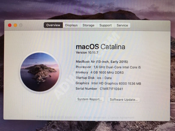 MacBook Air (13-inch, Early 2015) Processor 1,6 GHz Dual-Core Intel Core i5 Memory 4 GB 1600 MHz DDR3 Startup Disk ios - Data Graphics Intel HD Graphics 6000 1536 MB