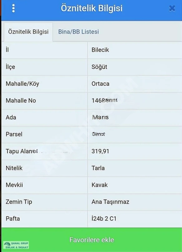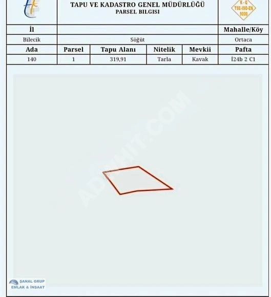 Land with an area of 319.19 m², classified as a field (Tarla)