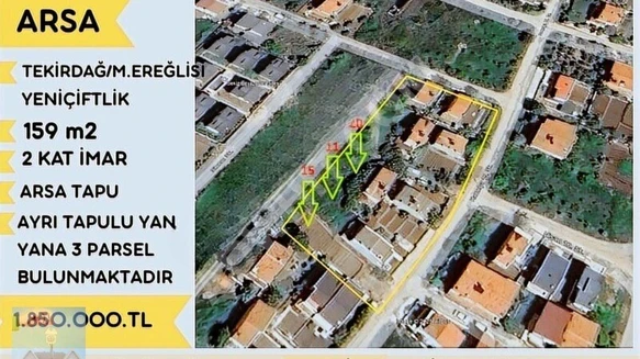 3 adjacent land plots are located in Marmaraereğlisi Yeniçiftlik Mahallesi, each plot with an area of 159 m², representing an unmissable opportunity for investors.