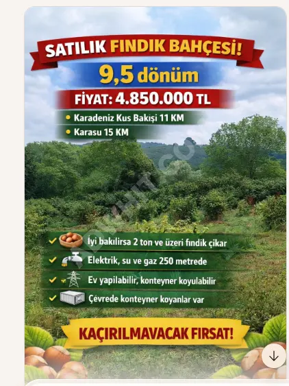 YENI YAPILAN OSBYI ABDUREZAK MAH 5 KM SAKARYA MERKEZ 37.5 KM mesafede bulunan, 9,5 dönüm büyüklüğünde çok amaçlı fındık bahçesi sahibinden satılıktır.